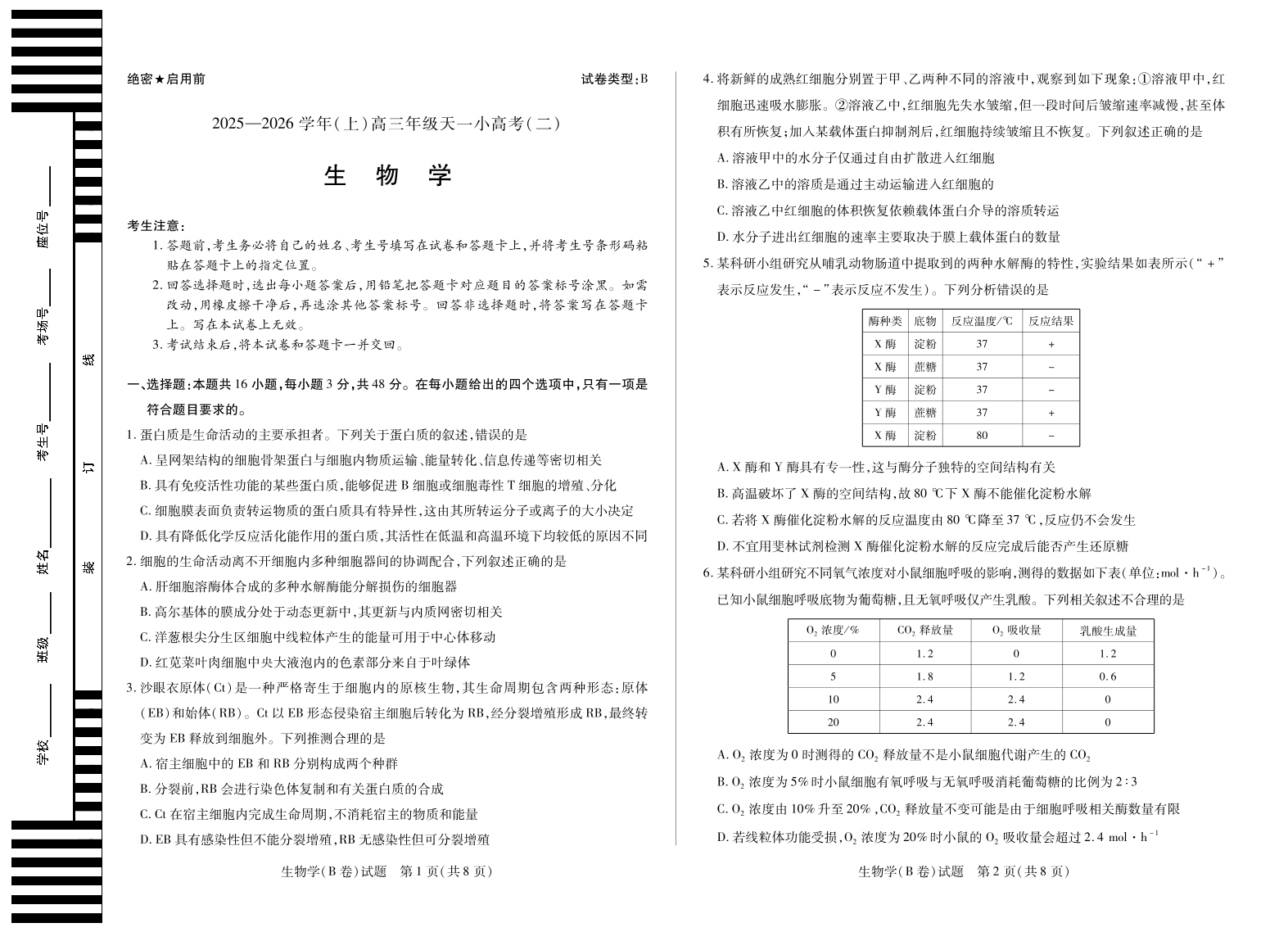 天一大联考·2025-2026学年(上)高三年级天一小高考(二)生物(B卷).pdf