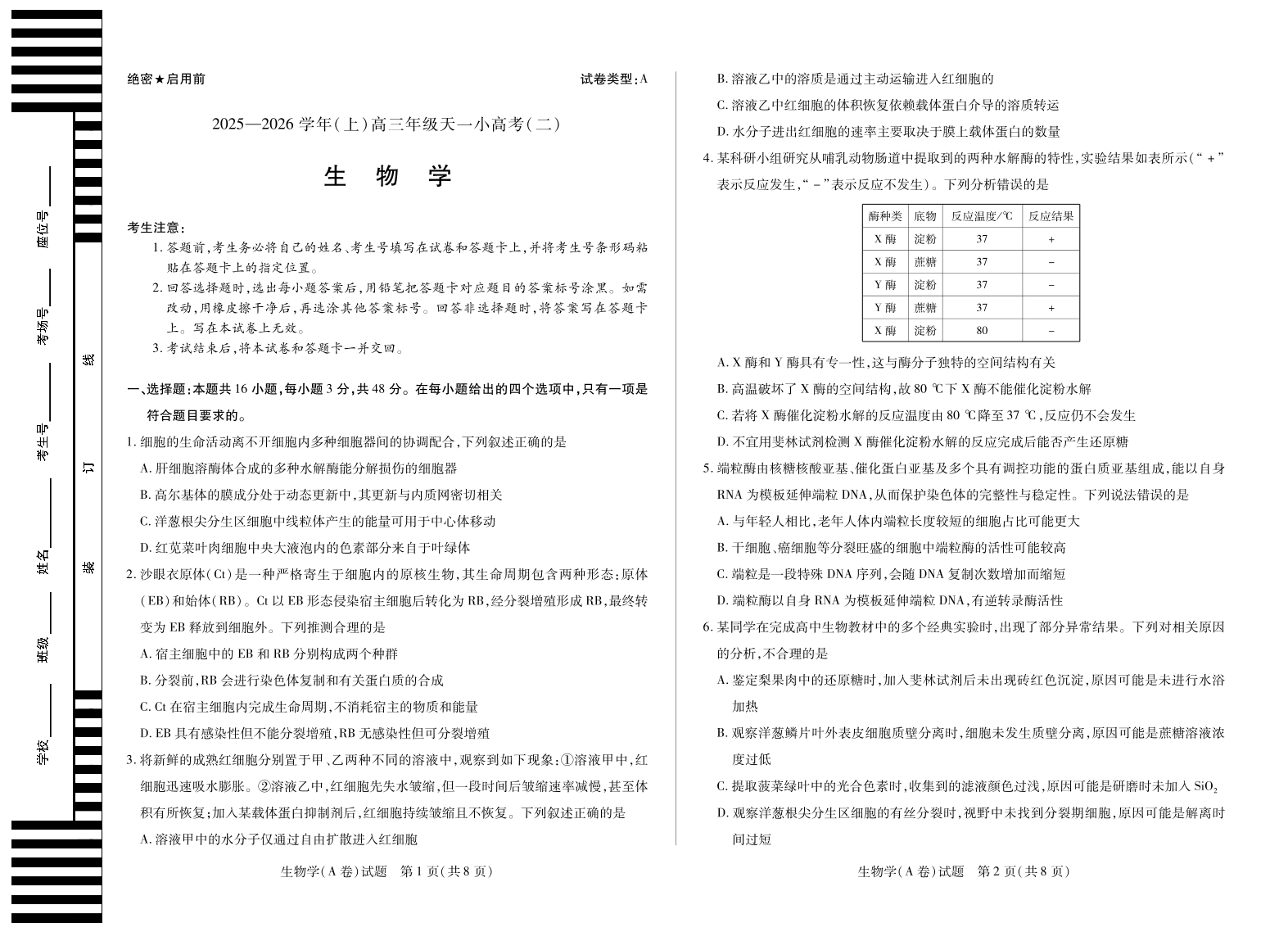 天一大联考·2025-2026学年(上)高三年级天一小高考(二)生物(A卷).pdf