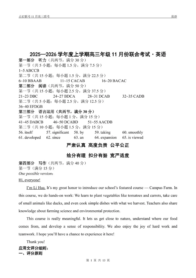 点石联考2025—2026学年度上学期高三年级11月份联合考试 英语答案.pdf