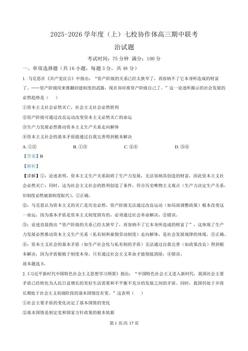 辽宁省七校协作体2025-2026学年高三上学期期中考试 政治答案.docx