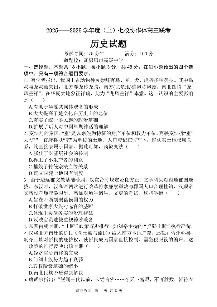 辽宁省七校协作体2025-2026学年高三上学期期中考试 历史.pdf