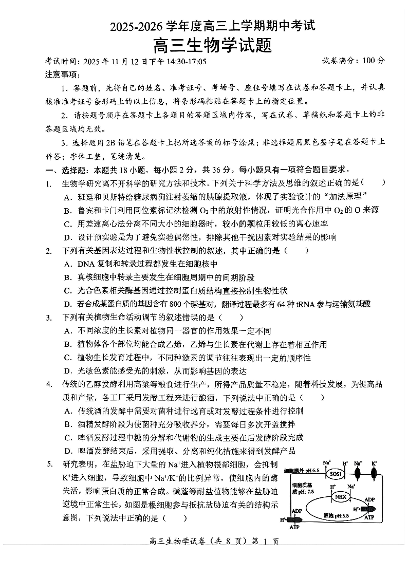 楚天协作体2025-2026学年度高三上学期期中考试 生物.pdf