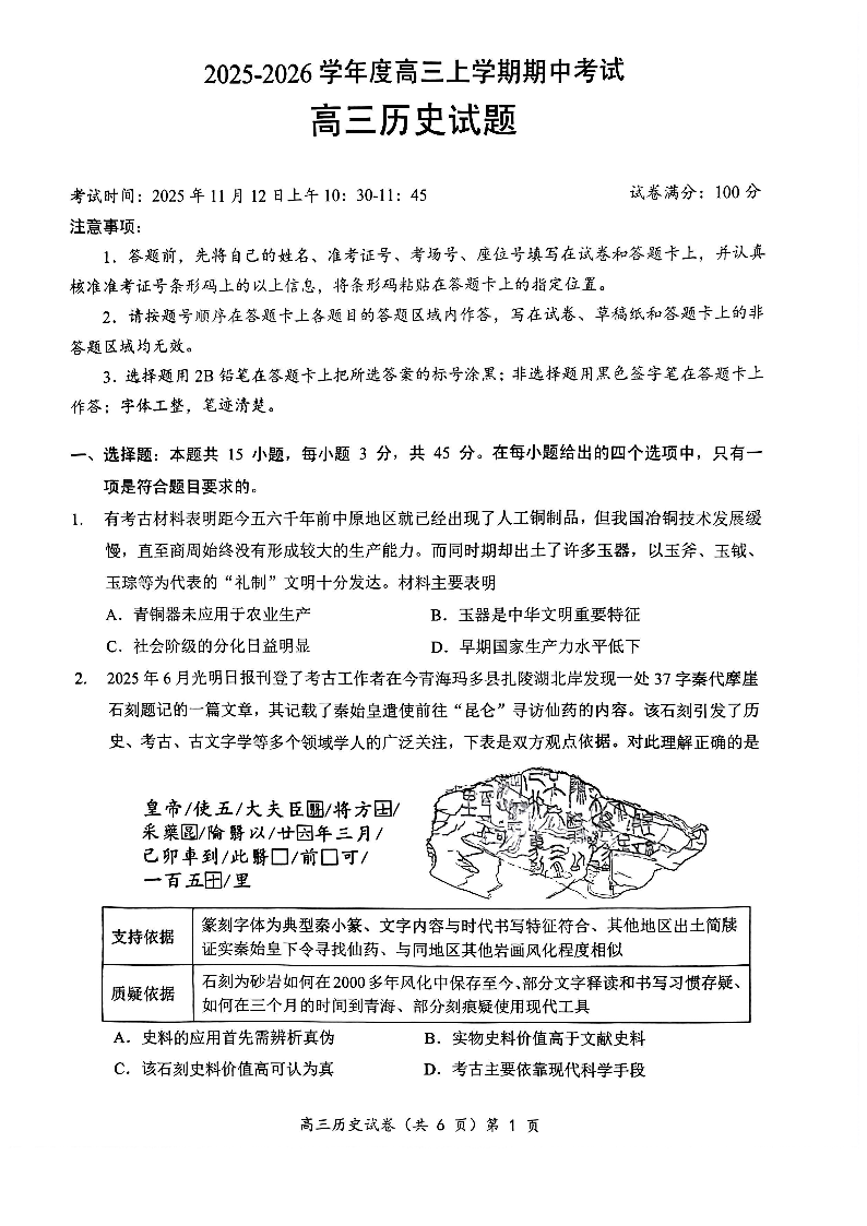 楚天协作体2025-2026学年度高三上学期期中考试 历史.pdf