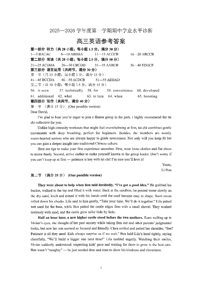 2025—2026学年度第一学期期中学业水平诊断 英语答案.pdf