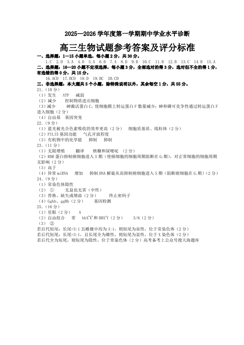 2025—2026学年度第一学期期中学业水平诊断 生物答案.pdf