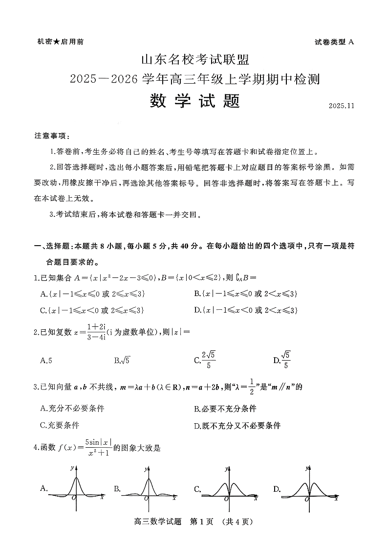 山东名校考试联盟2025一2026学年高三年级上学期期中检测 数学(A卷).pdf