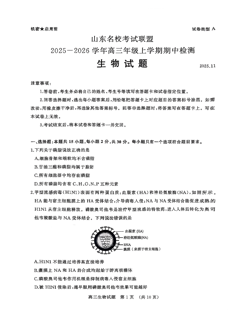 山东名校考试联盟2025一2026学年高三年级上学期期中检测 生物.pdf