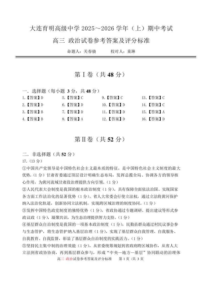 辽宁省大连育明高级中学2026届高三上学期11月期中考试 政治答案.docx