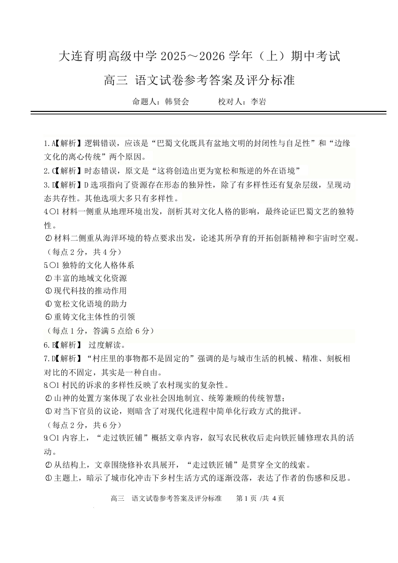 辽宁省大连育明高级中学2026届高三上学期11月期中考试 语文答案.docx