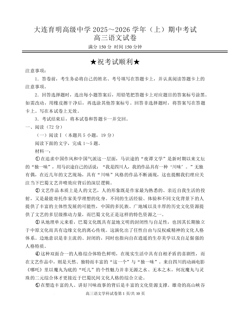 辽宁省大连育明高级中学2026届高三上学期11月期中考试 语文.docx