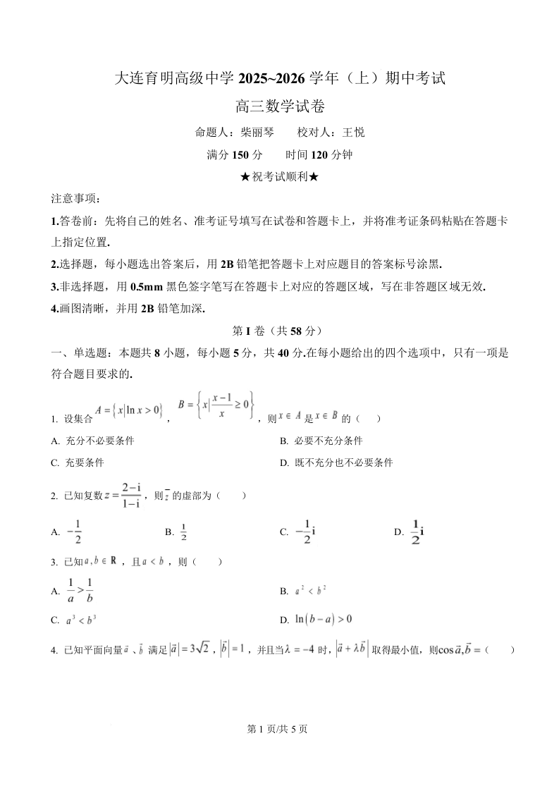 辽宁省大连育明高级中学2026届高三上学期11月期中考试 数学.docx