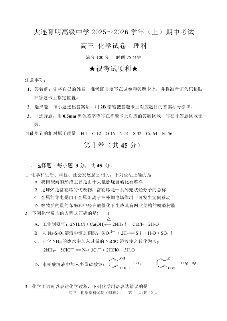 辽宁省大连育明高级中学2026届高三上学期11月期中考试 化学.docx