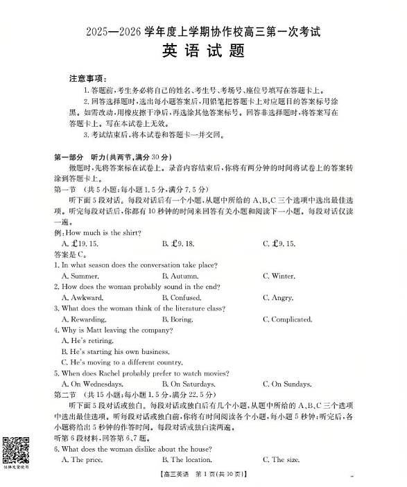 辽宁省葫芦岛市协作校2026届高三上学期第一次考试 英语.pdf