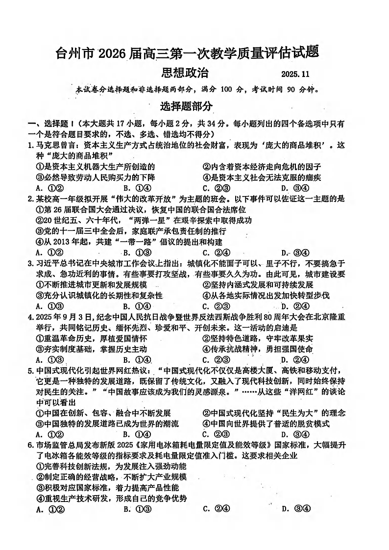 台州市2026届高三第一次教学质量评估试题 政治.pdf