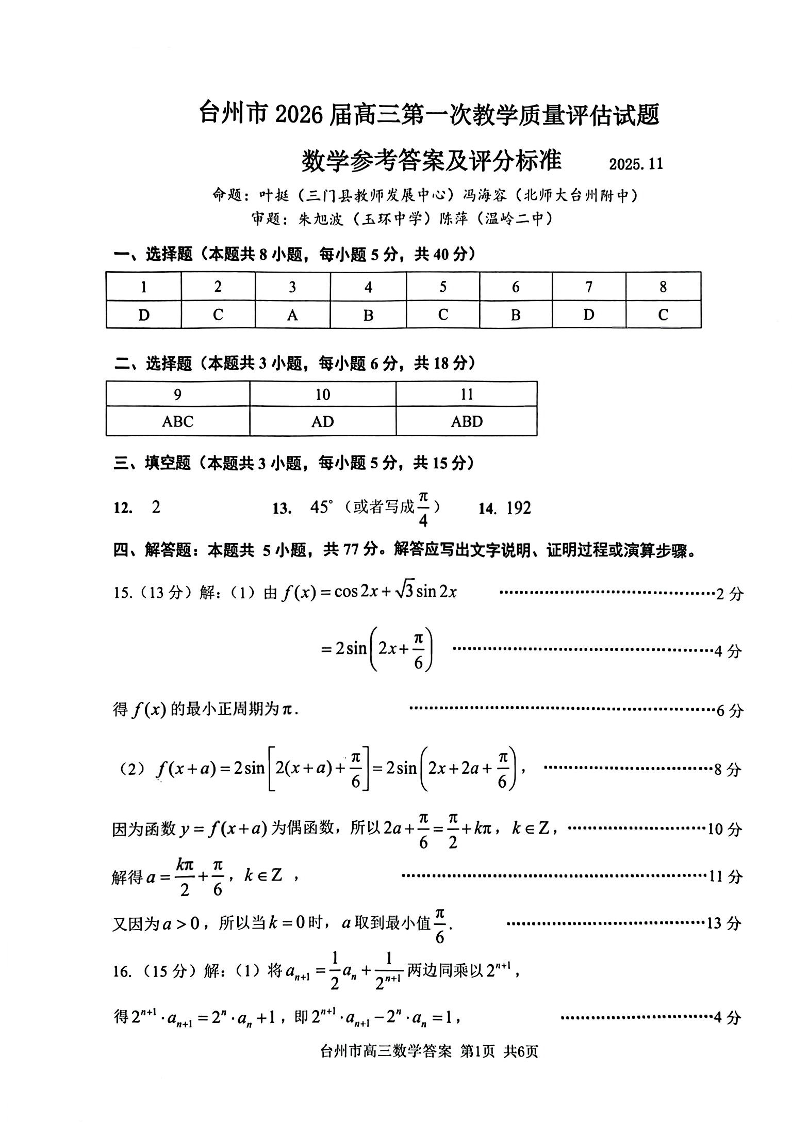 台州市2026届高三第一次教学质量评估试题 数学答案.pdf