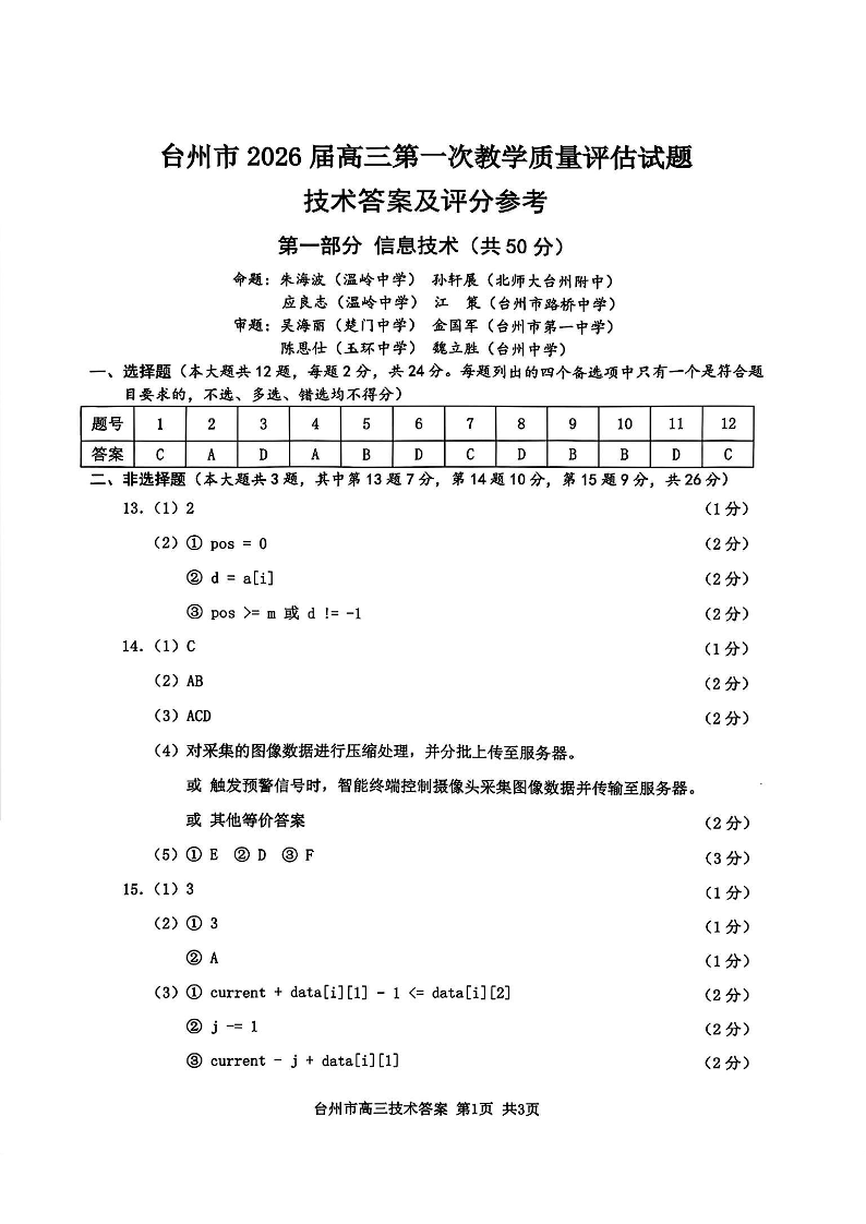 台州市2026届高三第一次教学质量评估试题 技术答案.pdf