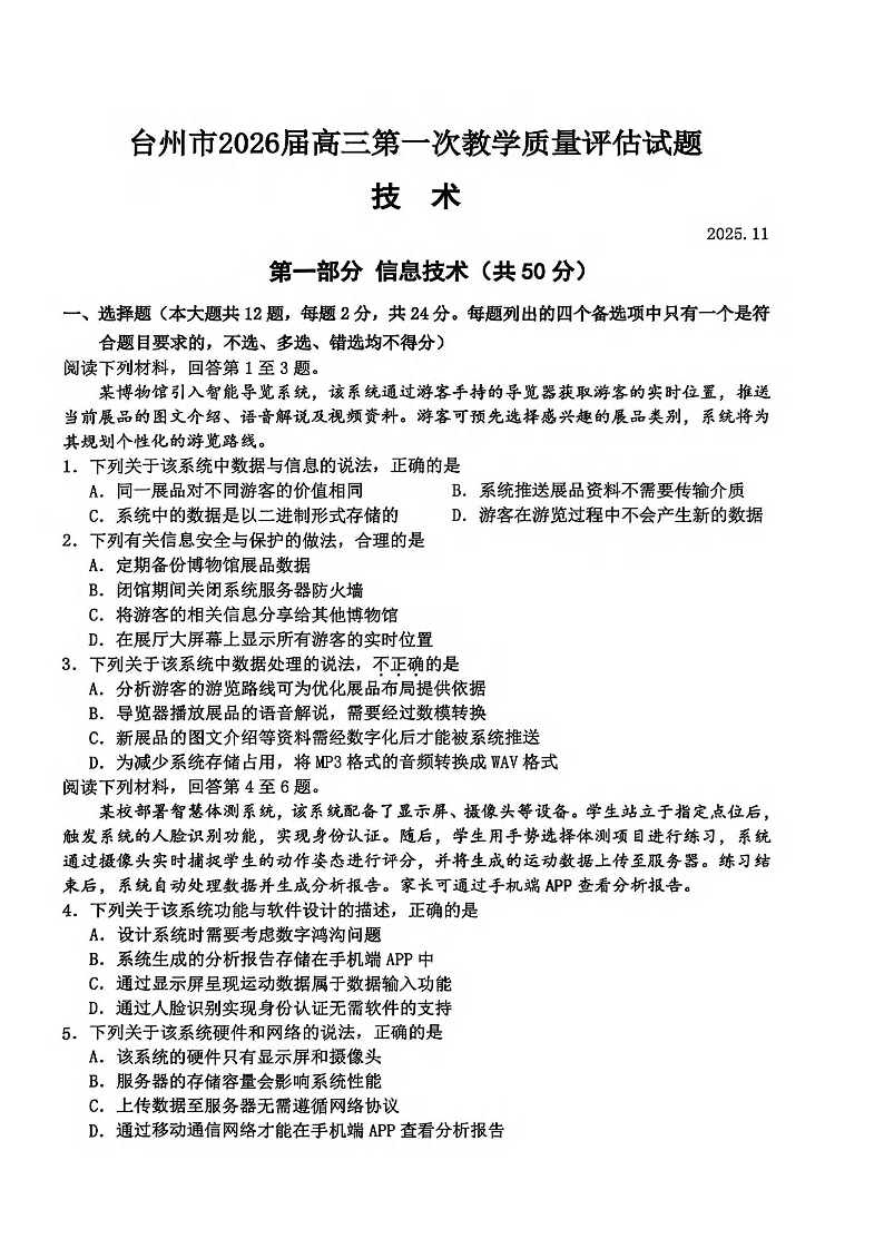 台州市2026届高三第一次教学质量评估试题 技术.pdf