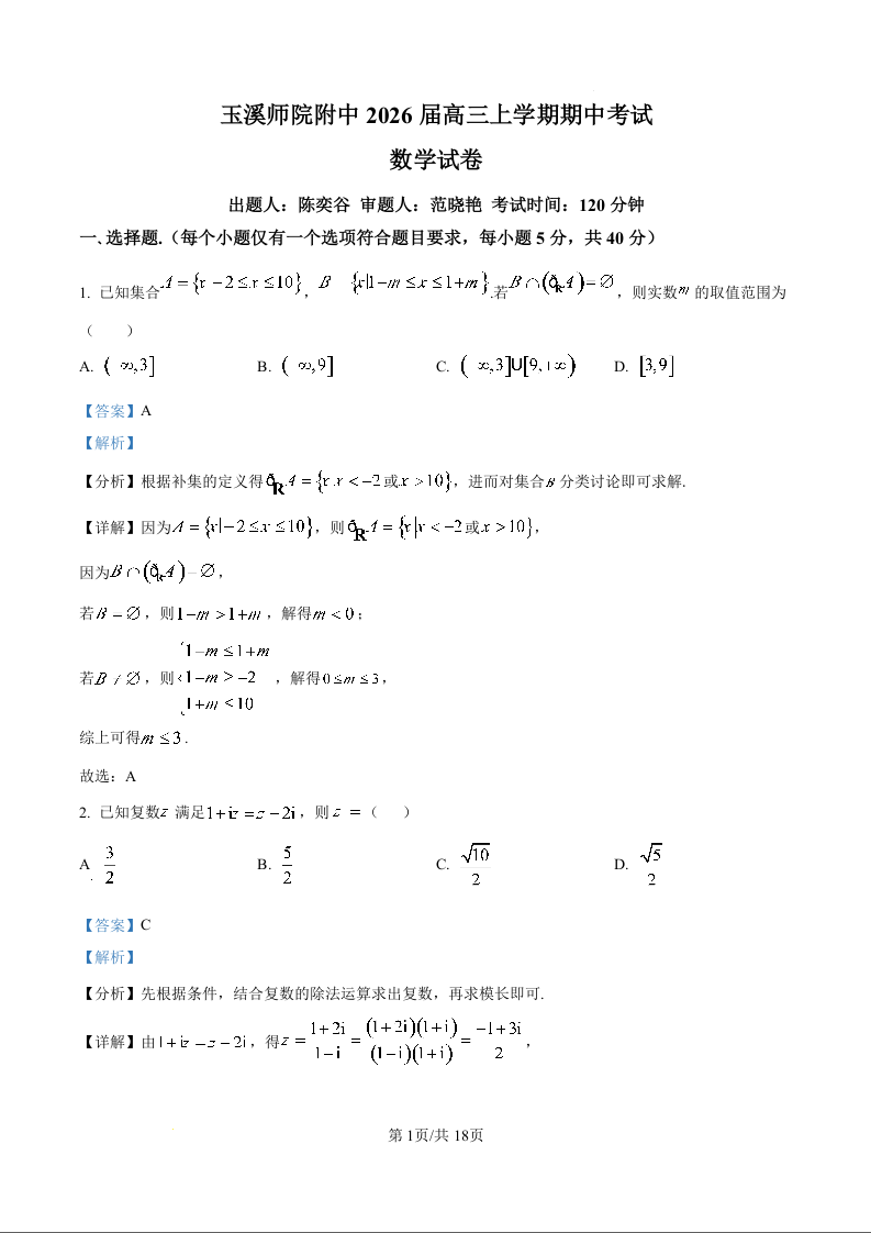 云南省玉溪师范学院附属中学2026届高三11月期中考试 数学答案.docx