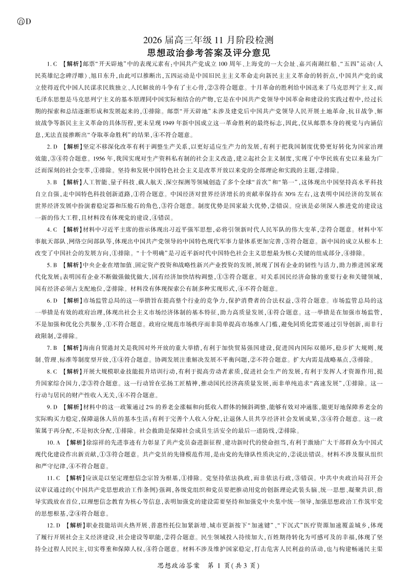 四川省百师联盟2026届高三年级11月阶段检测 政治答案.pdf
