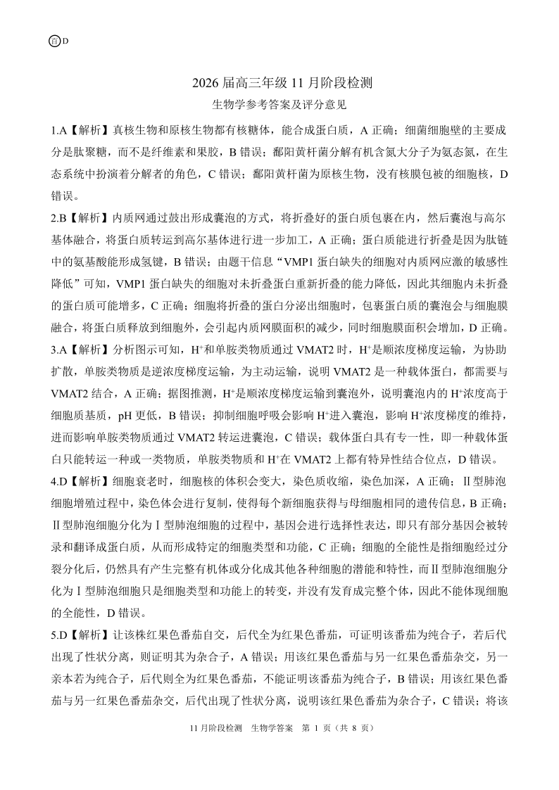 四川省百师联盟2026届高三年级11月阶段检测 生物答案.pdf