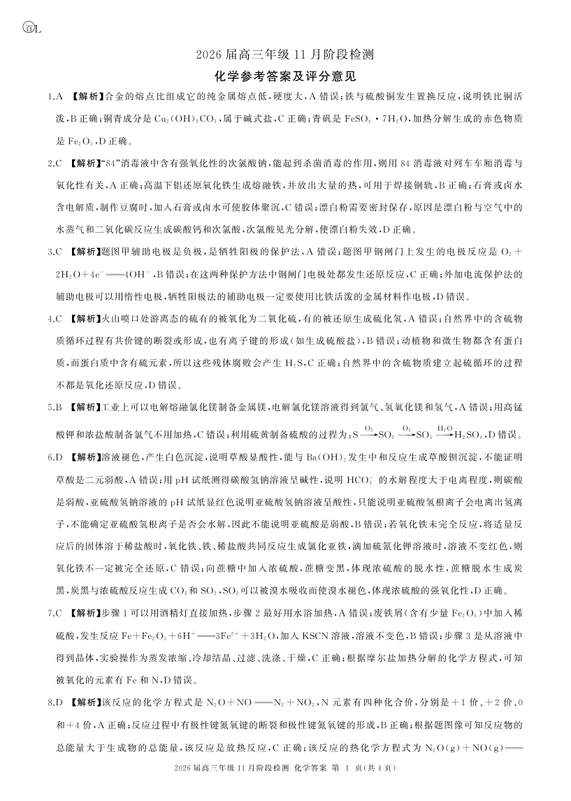 四川省百师联盟2026届高三年级11月阶段检测 化学答案.pdf
