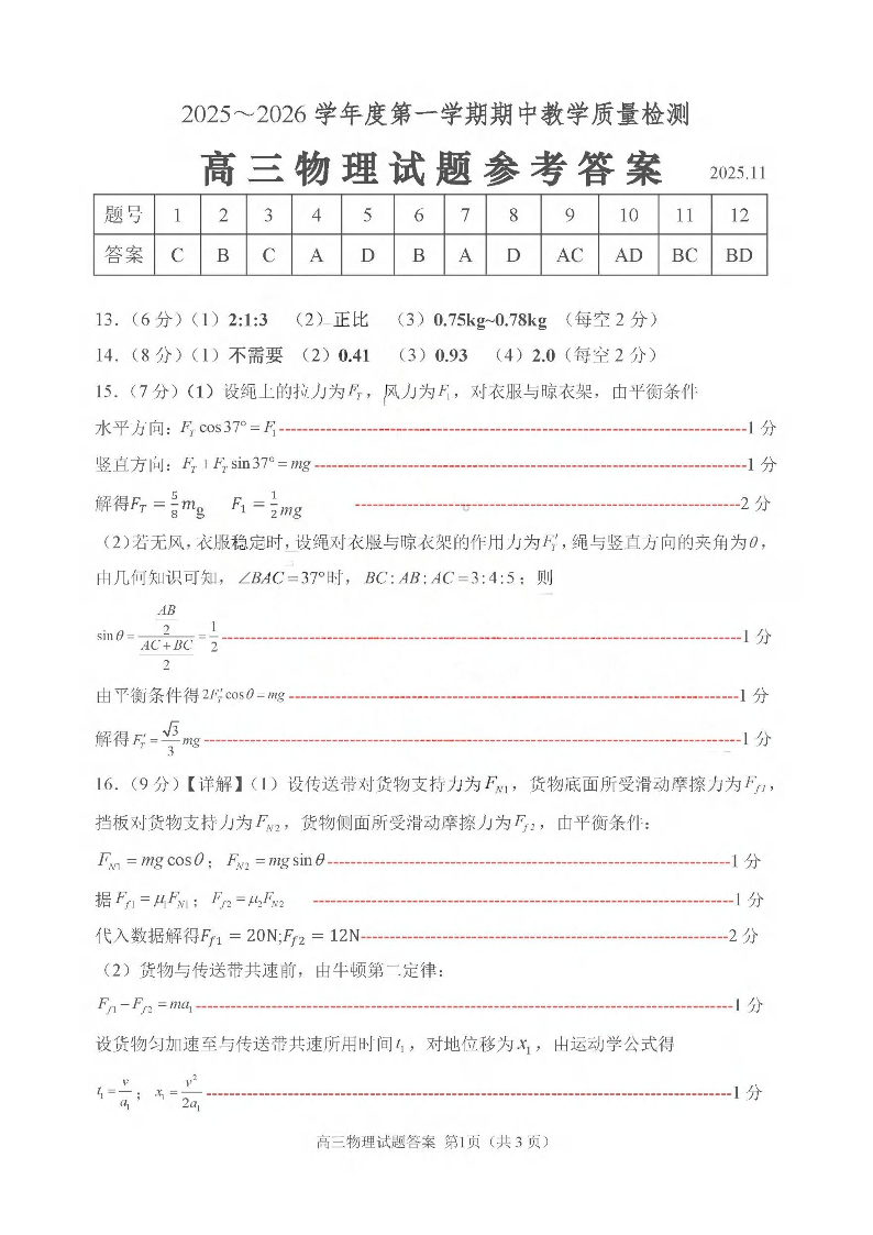 聊城市2025~2026学年度第一学期期中教学质量检测 物理答案.pdf