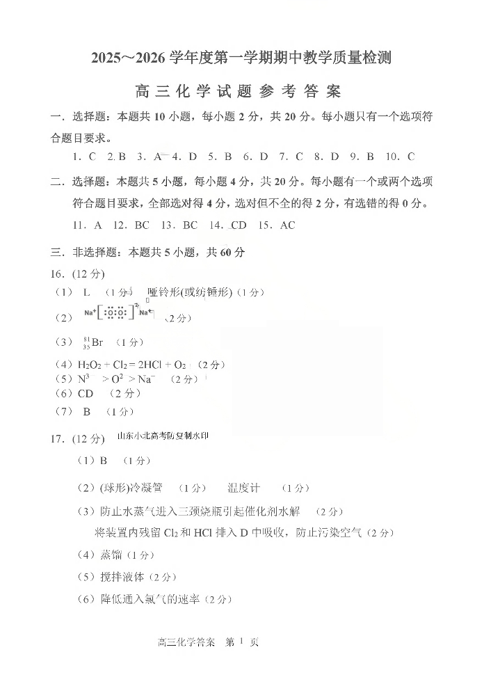 聊城市2025~2026学年度第一学期期中教学质量检测 化学答案.pdf