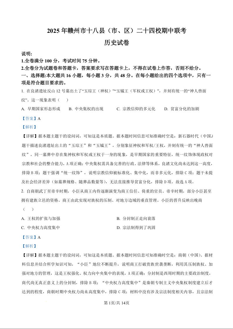 江西省2025年赣州市十八县(市、区)二十四校高三年级期中联考 历史答案.docx