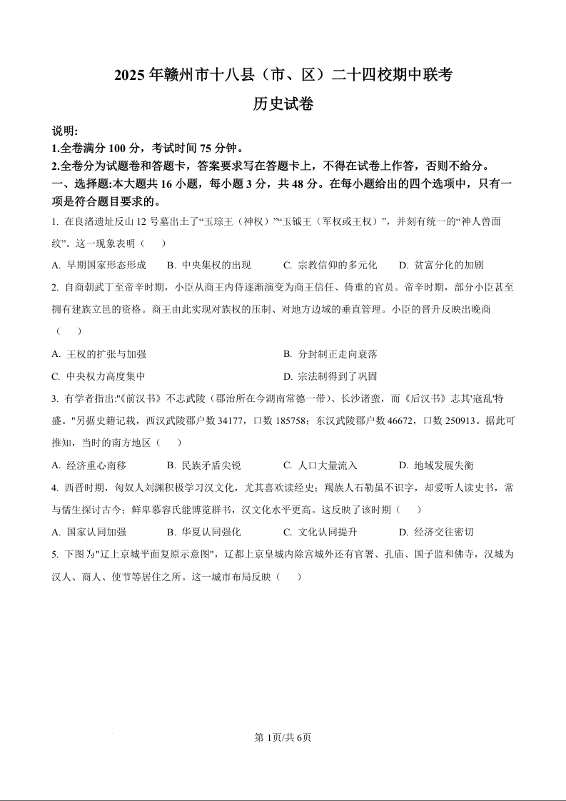 江西省2025年赣州市十八县(市、区)二十四校高三年级期中联考 历史.docx