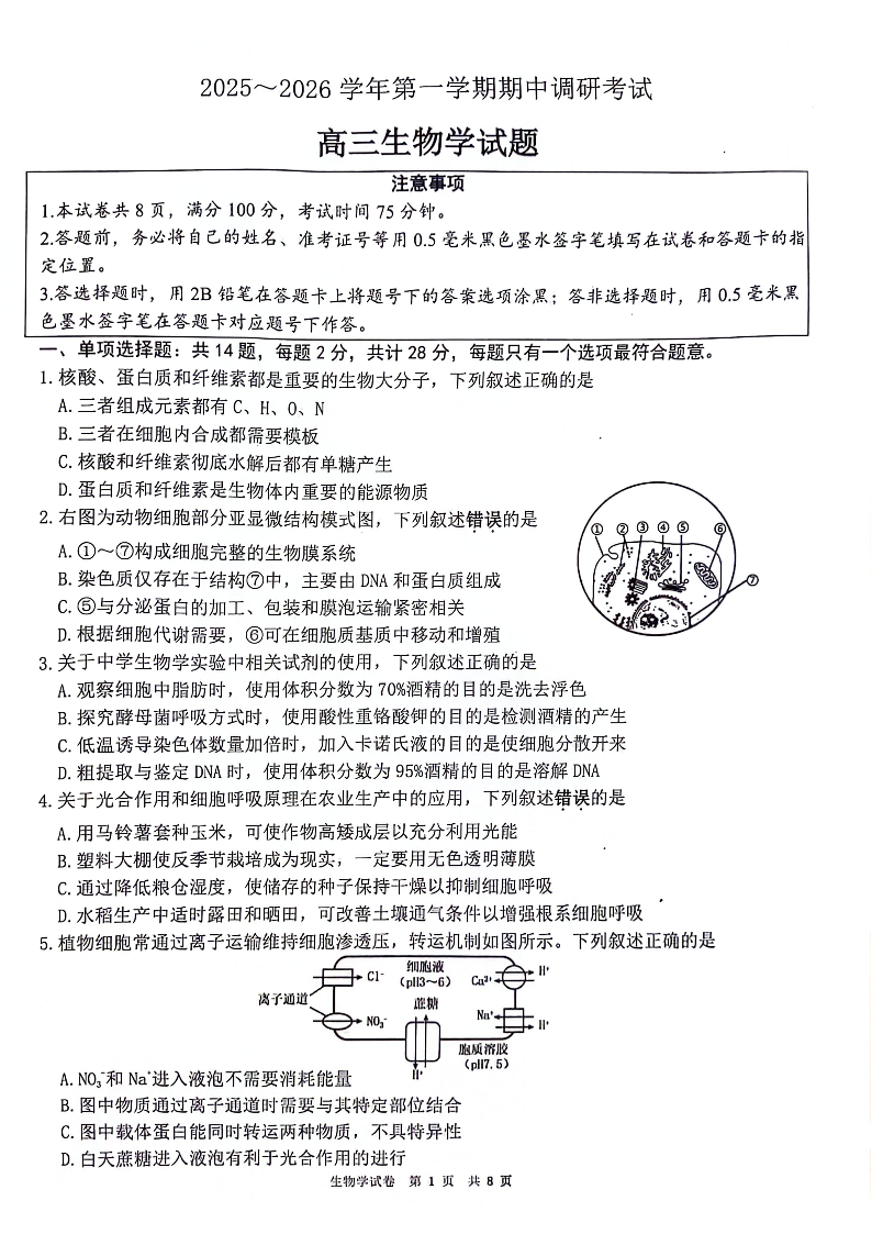 江苏省连云港市2025-2026学年第一学期高三年级期中调研考试 生物试题(含答案).pdf
