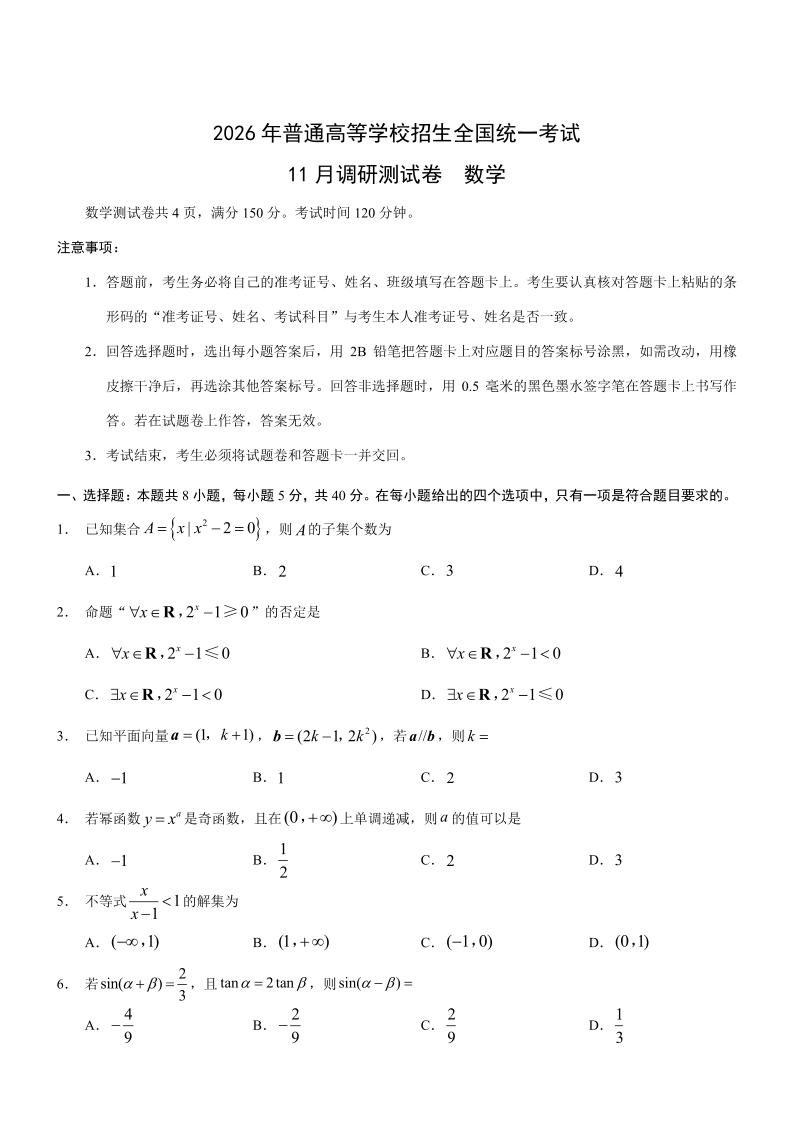 重庆市普通高中学业水平选择性考试11月调研测试卷 数学试题(含答案).pdf