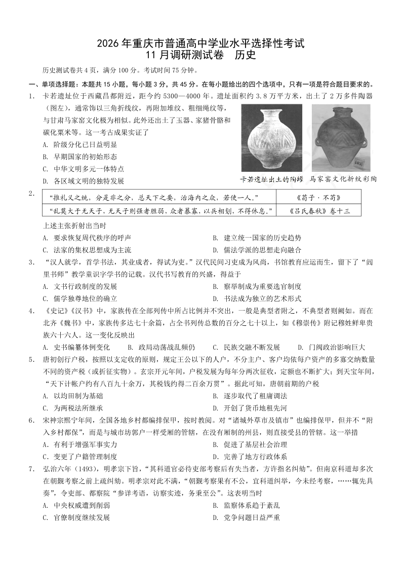 重庆市普通高中学业水平选择性考试11月调研测试卷 历史试题(含答案).pdf