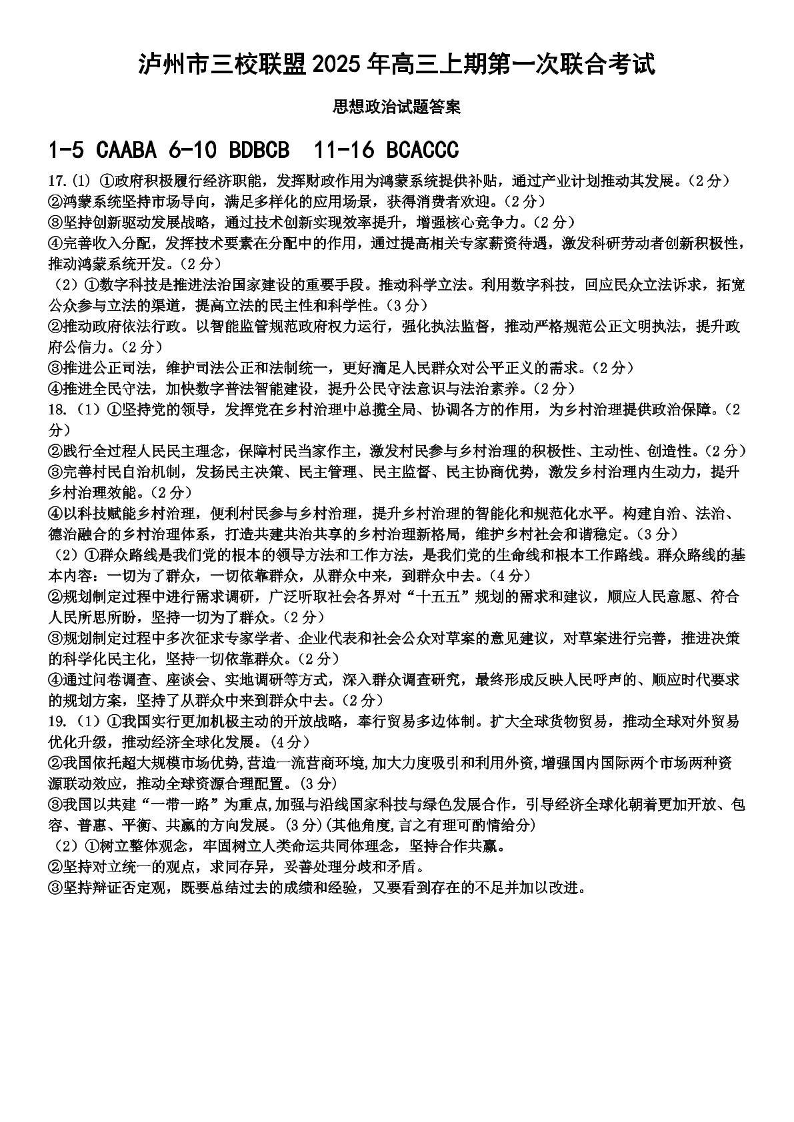 泸州市三校联盟2025年高三上期第一次联合考试 政治答案.pdf