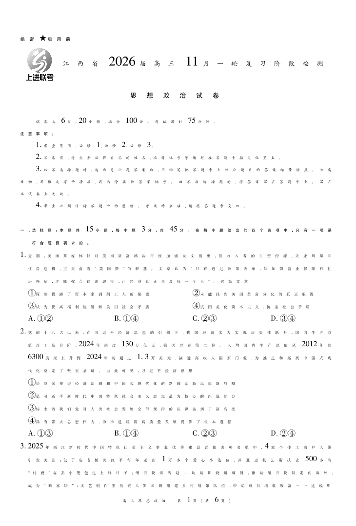 江西省2026届高三11月一轮复习阶段检测 政治.pdf