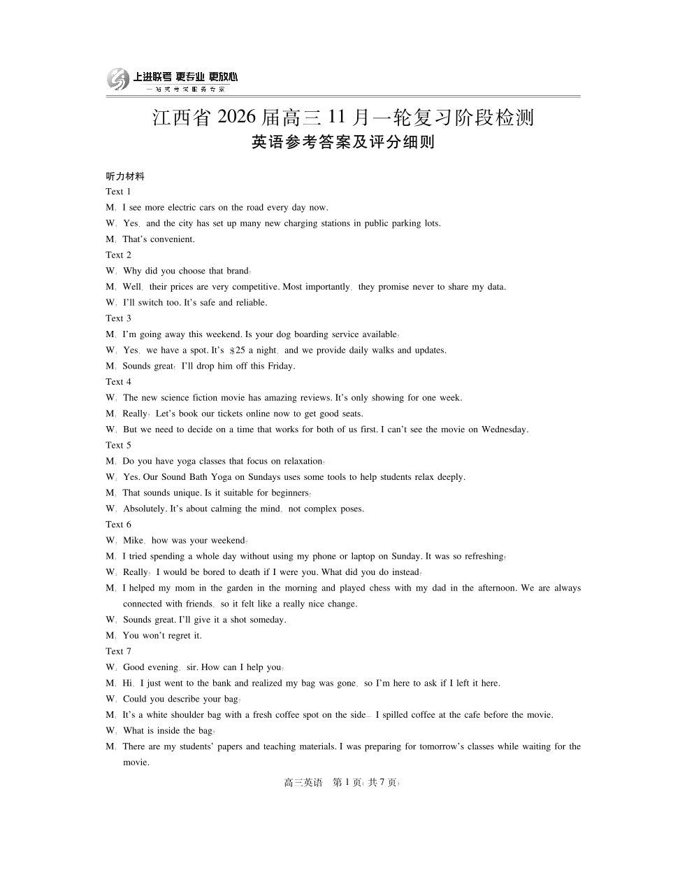 江西省2026届高三11月一轮复习阶段检测 英语答案.pdf