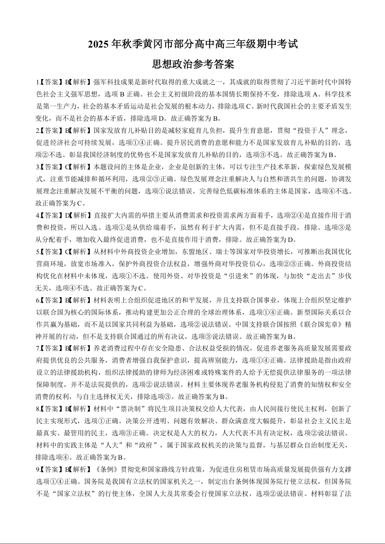 湖北省黄冈市部分高中2026届高三上学期期中考试 政治答案.docx