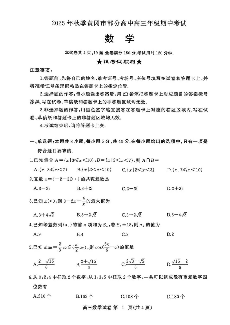 湖北省黄冈市部分高中2026届高三上学期期中考试 数学试卷(含答案).pdf