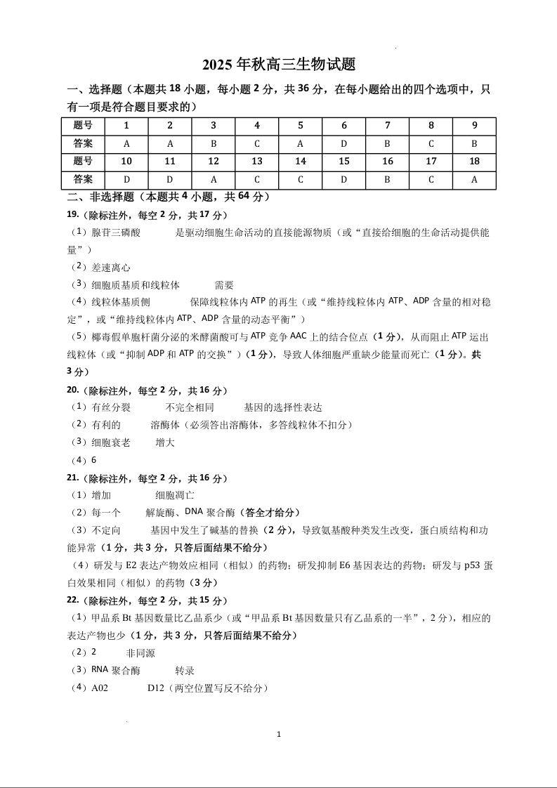 湖北省黄冈市部分高中2026届高三上学期期中考试 生物答案.docx
