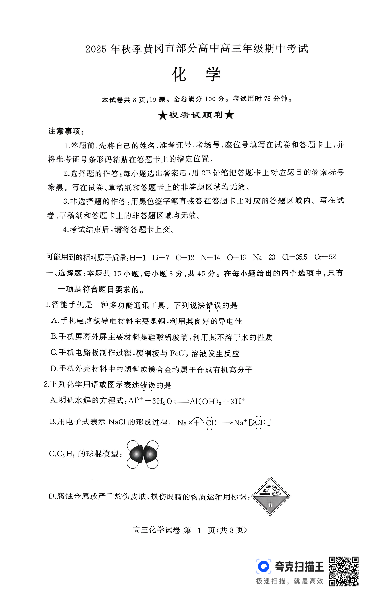 湖北省黄冈市部分高中2026届高三上学期期中考试 化学.pdf