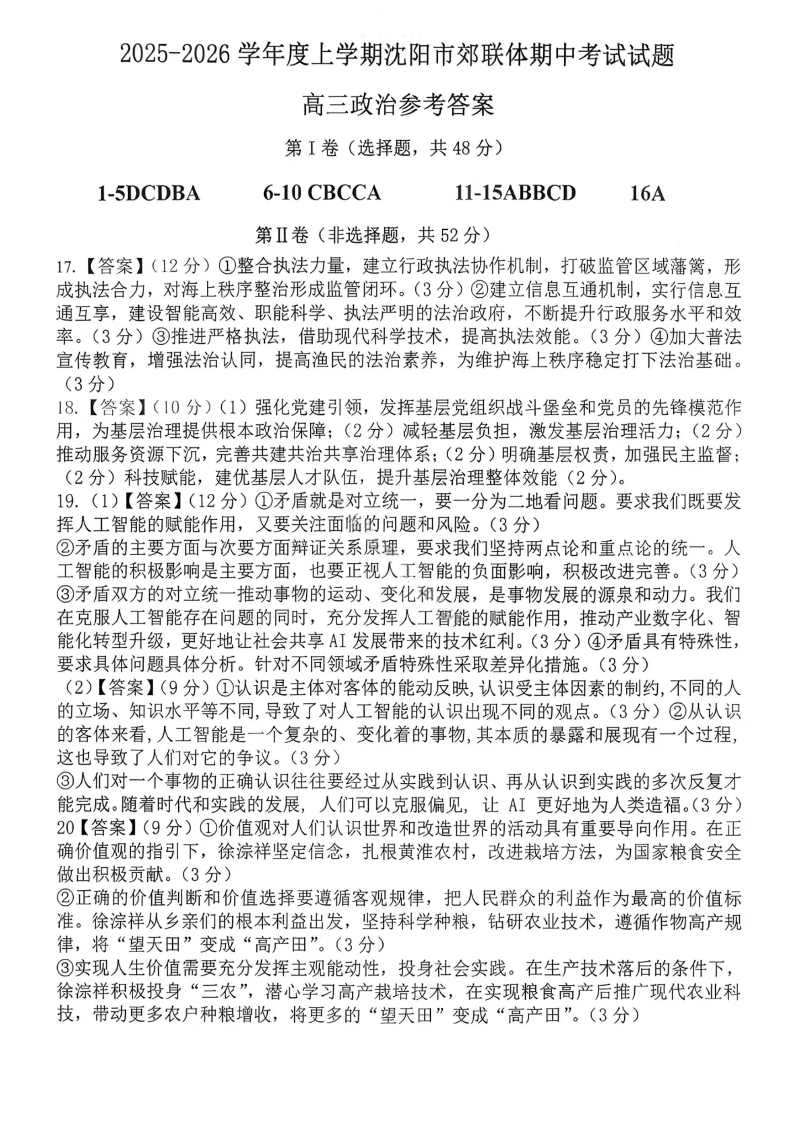 沈阳市郊联体2025一2026学年度上学期高三年级期中考试 政治答案.pdf