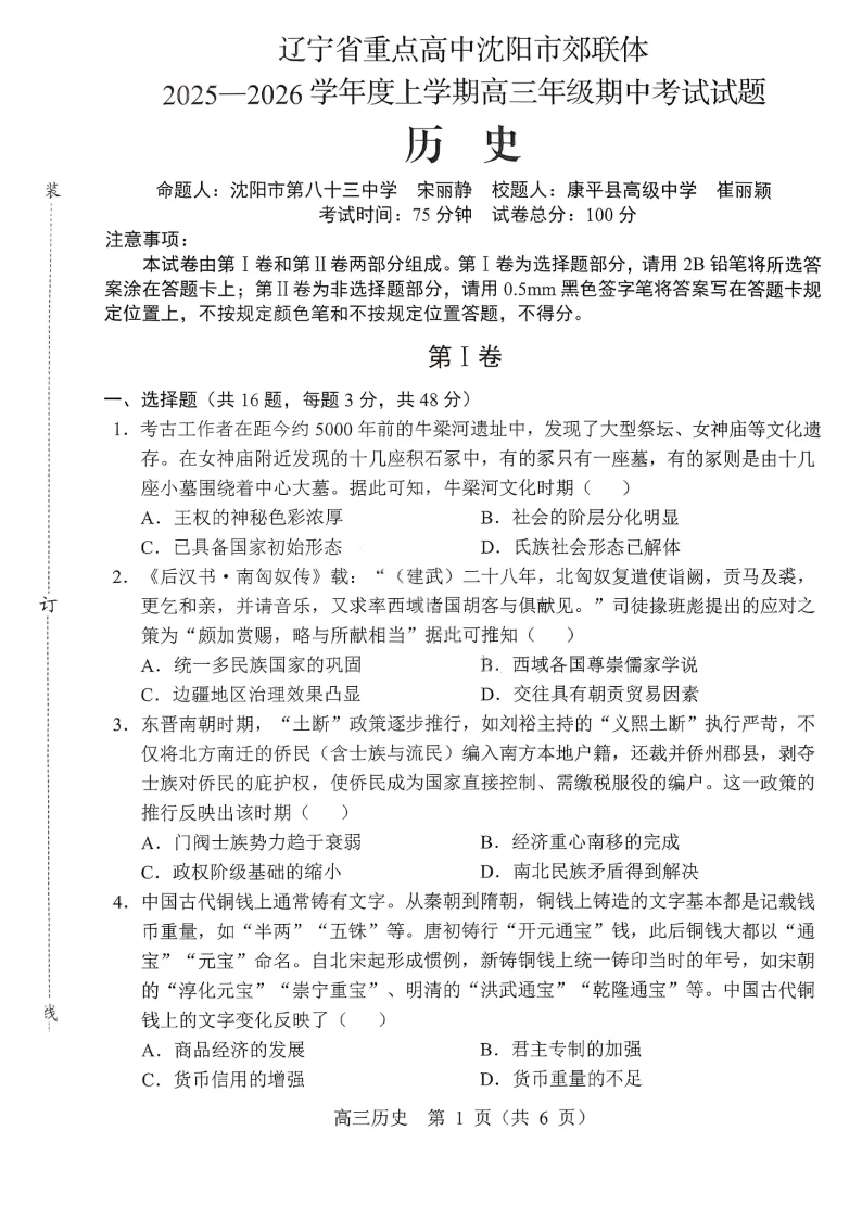 沈阳市郊联体2025一2026学年度上学期高三年级期中考试 历史.pdf