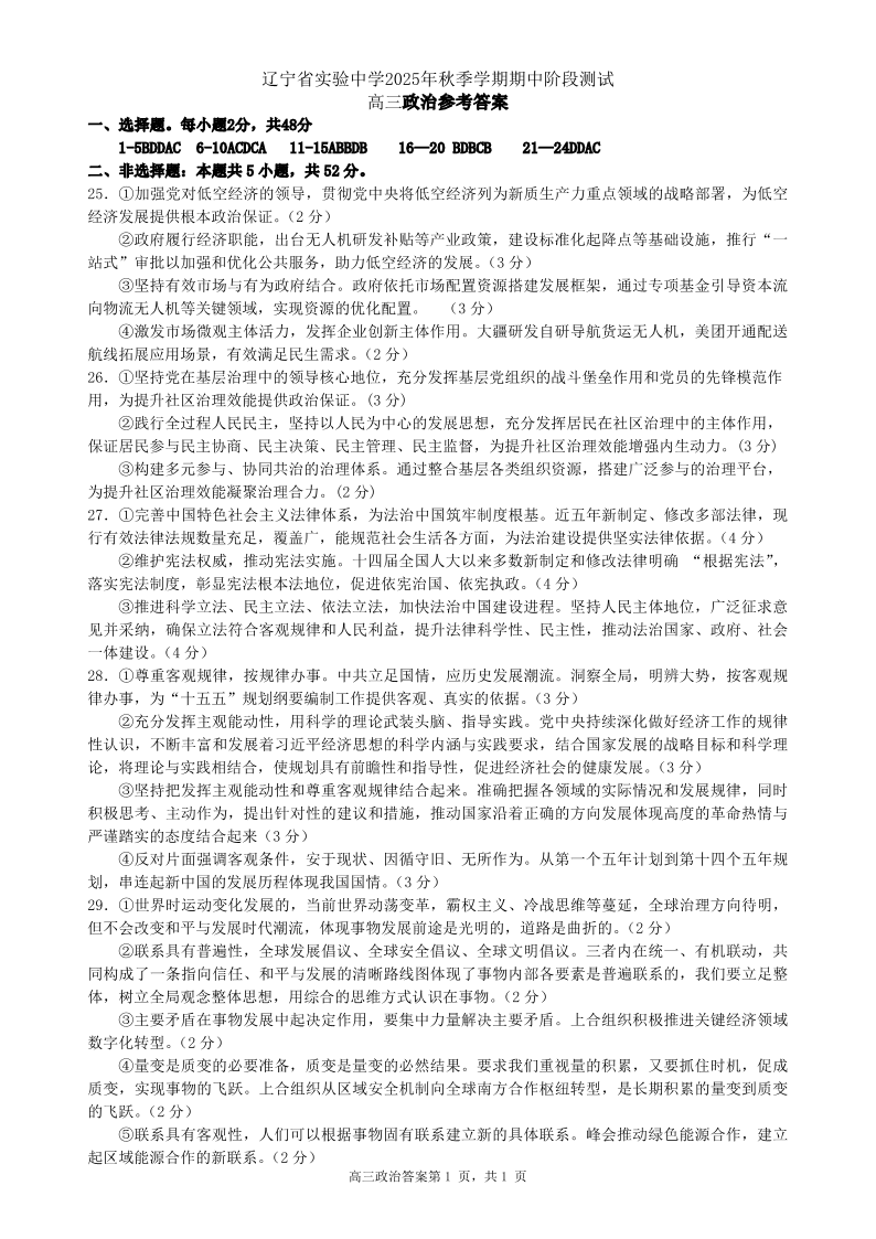 辽宁省实验中学2025年秋季期中阶段测试 政治答案.pdf
