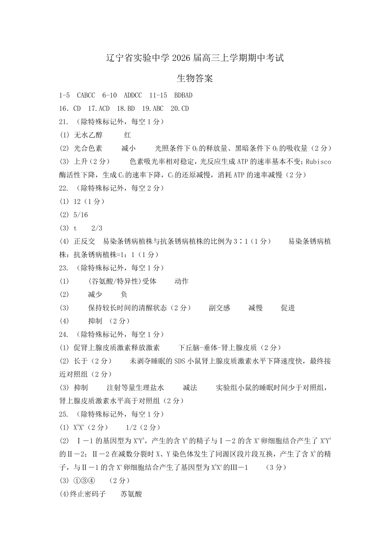 辽宁省实验中学2025年秋季期中阶段测试 生物答案.pdf