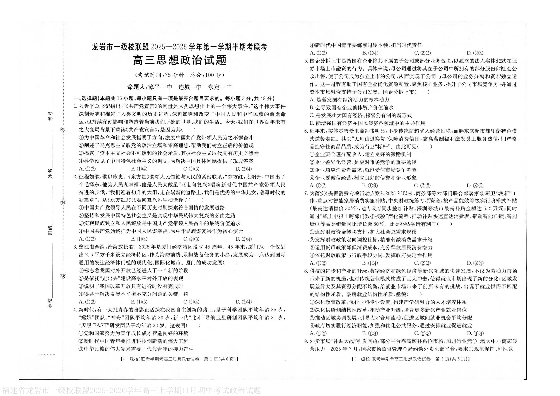 福建省龙岩市一级校联盟2026届高三年级第一学期半期考联考 政治试题(含答案).pdf