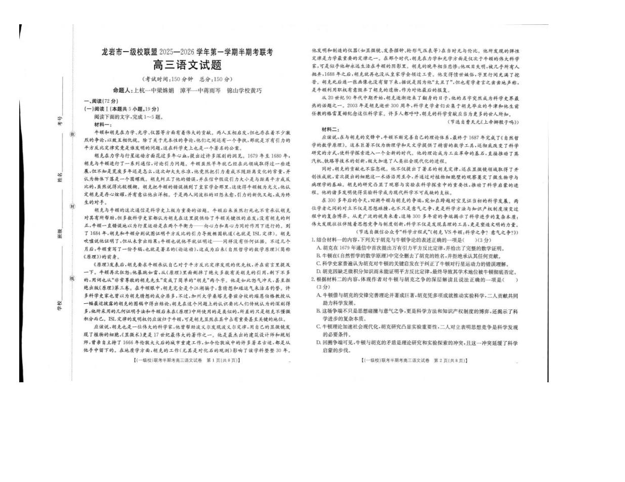 福建省龙岩市一级校联盟2026届高三年级第一学期半期考联考 语文试题(含答案).pdf