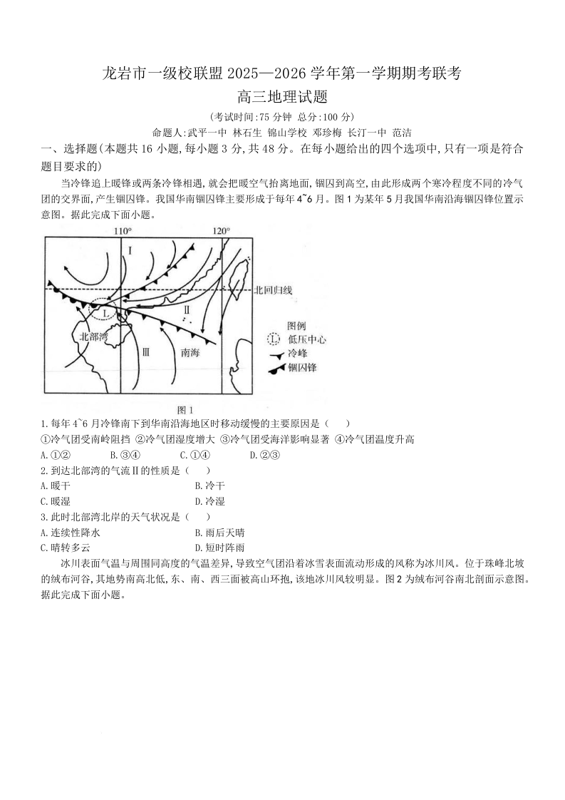 福建省龙岩市一级校联盟2026届高三年级第一学期半期考联考 地理试题(含答案).docx