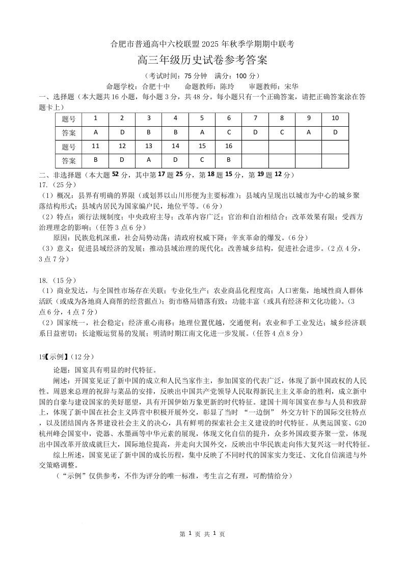 合肥市普通高中六校联盟2025年秋季学期期中考试 历史答案.docx