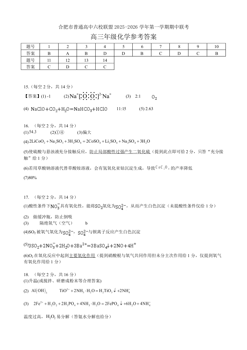 合肥市普通高中六校联盟2025年秋季学期期中考试 化学答案.docx