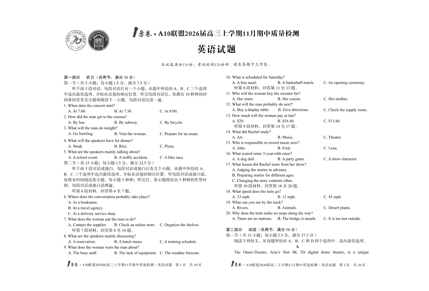 1号卷·A10联盟2026届高三上学期11月期中质量检测 英语.pdf