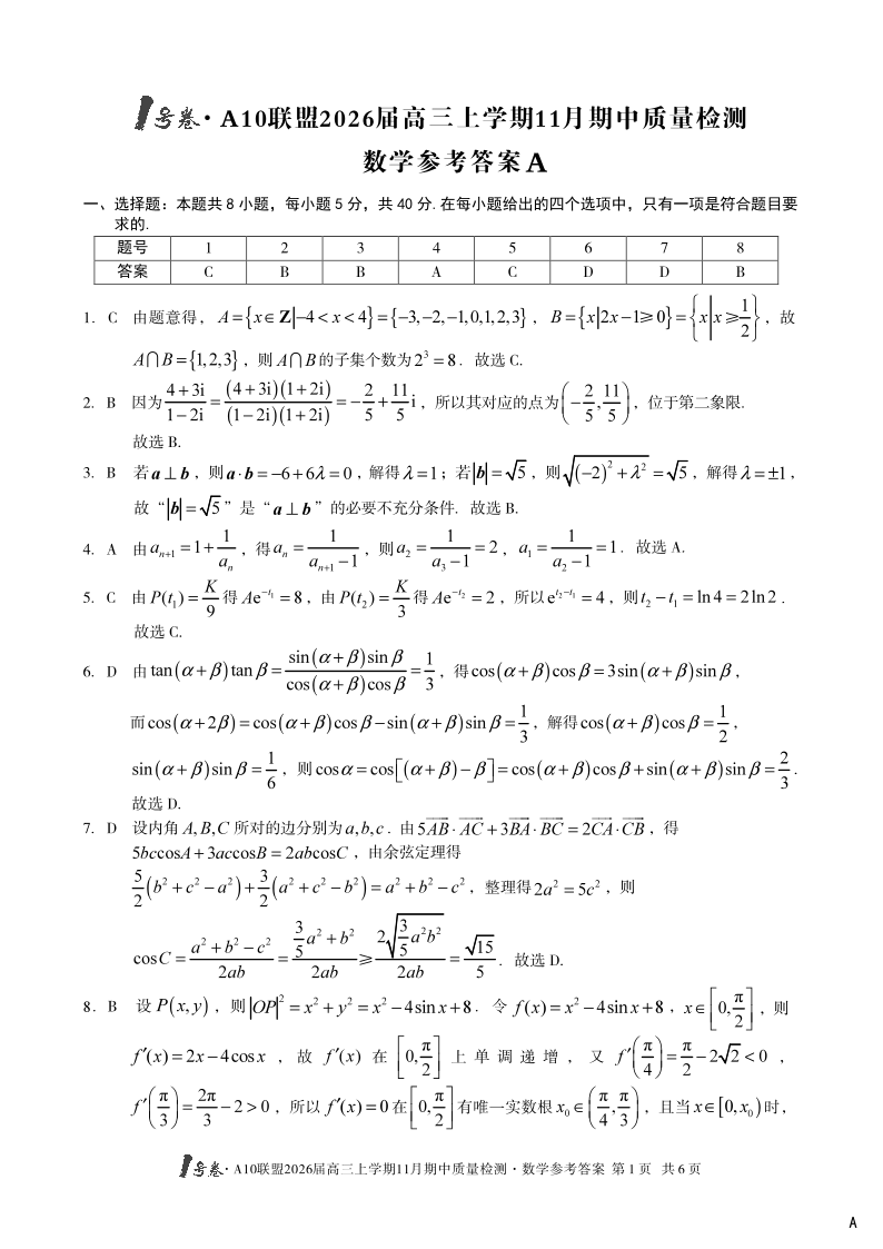 1号卷·A10联盟2026届高三上学期11月期中质量检测 数学答案.pdf